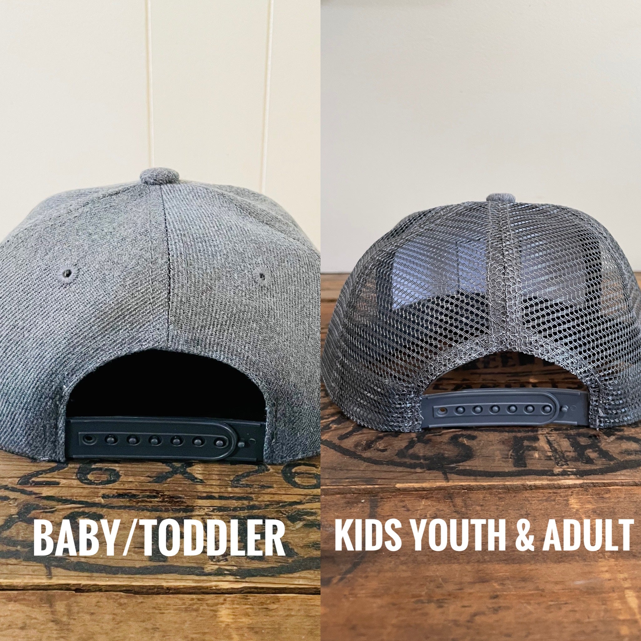 ADULT (mesh back style): Available upon request for older kids or larger head sizes. Message us for ordering.